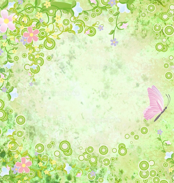 Зеленый гранжевый фон с яркой рамкой и бабочкой