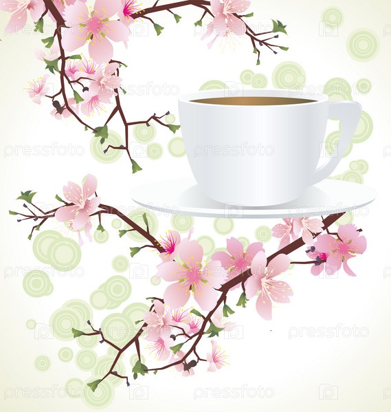 Чашка и ветви цветущей сакуры или вишни