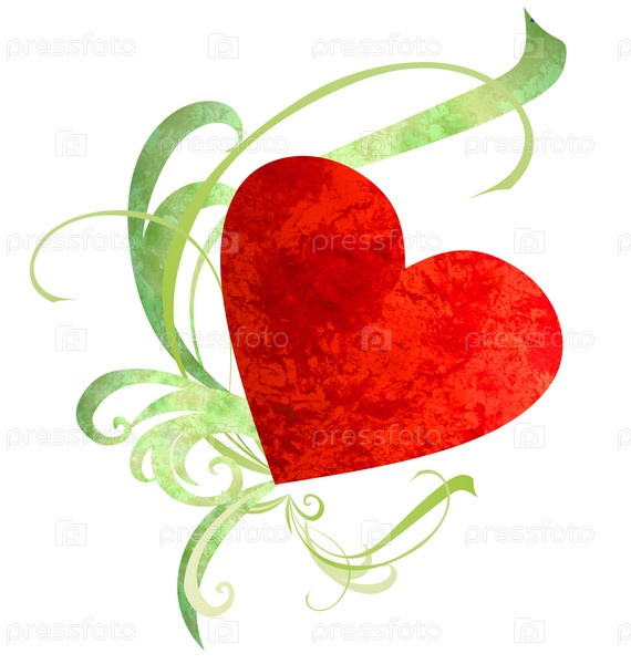 Красное сердце с зеленым растительным орнаментом, изолированное на белом фоне