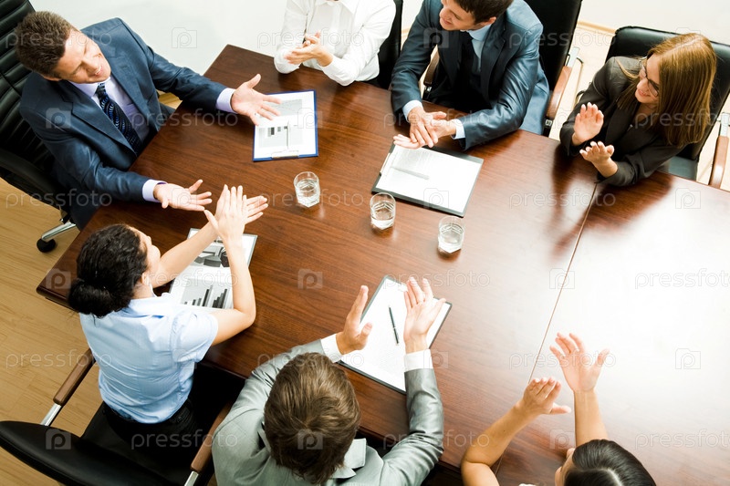 Выше снимок счастливых деловых партнеров, аплодирующих уверенному в себе лидеру на встрече