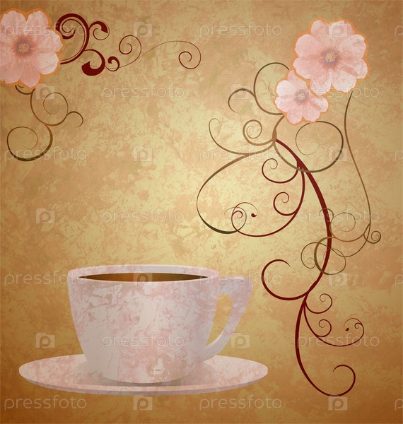Розовые цветы и чашка кофе на коричневом гранжевом фоне из старой бумаги