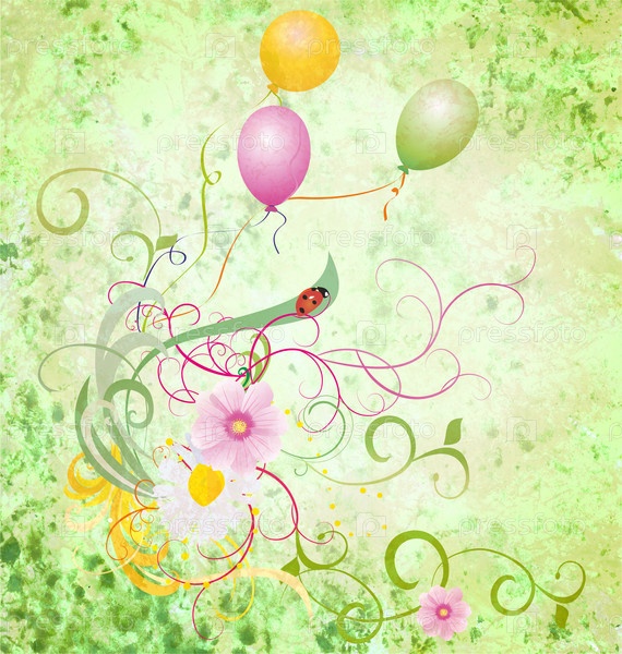 Весенний или летний текстурированный фон с шарами, цветами и божьей коровкой
