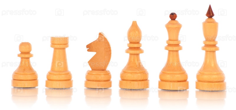 Шахматы. Группа светлых деревянных шахматных фигур на белом фоне