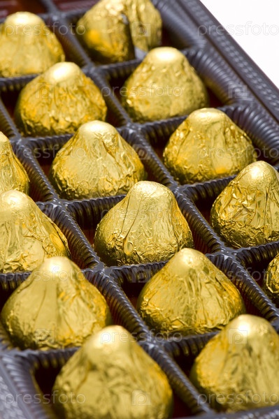 Шоколадные конфеты в коробке на белом ближайшем снимке