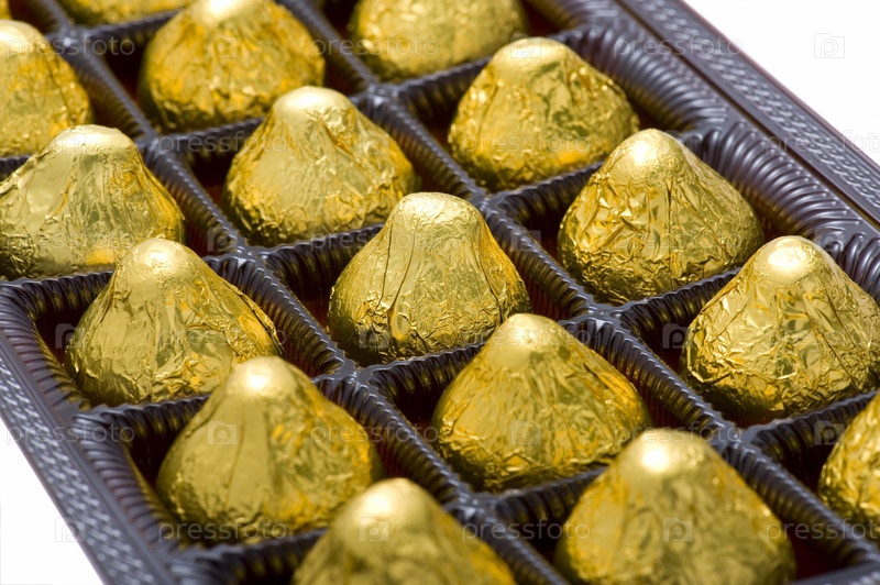 Шоколадные конфеты в коробке на белом ближайшем снимке