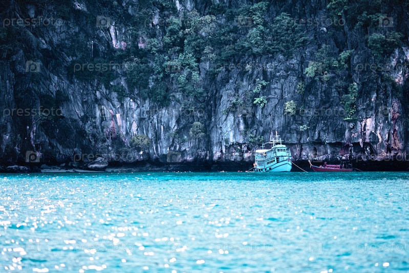 Скалистые берега и туристческий паром в Андаманском море, Таиланд