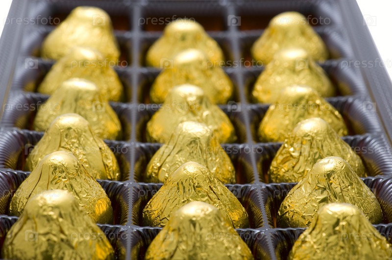 Шоколадные конфеты в коробке на белом ближайшем снимке