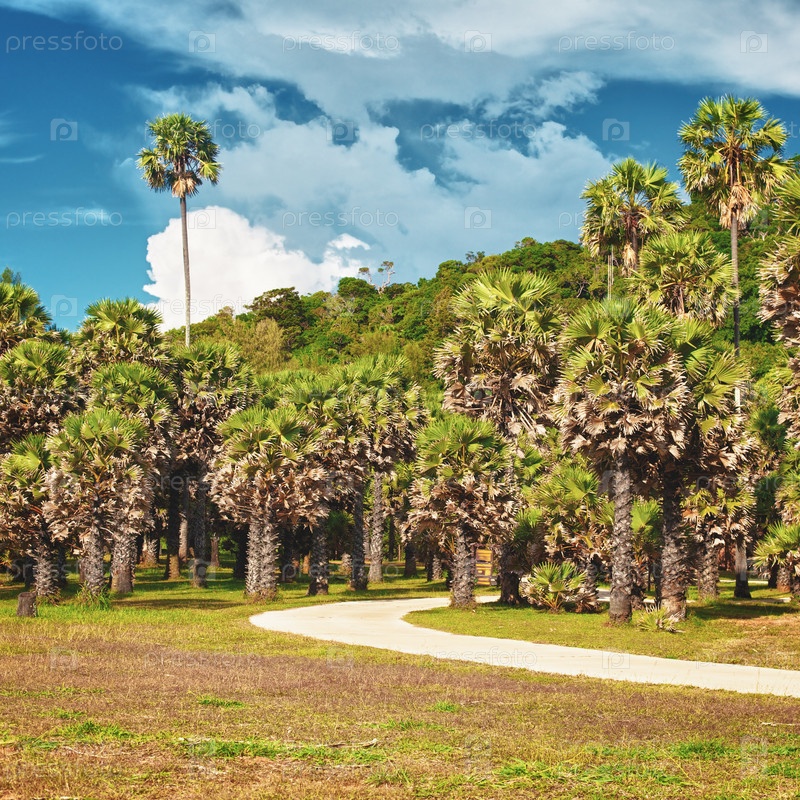 Парк с пальмами и тропинкой в летний день, Таиланд