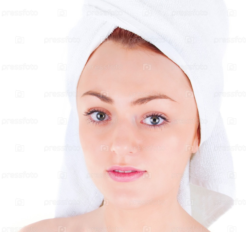 Молодая женщина с белым полотенцем на волосах и гладкой кожей на белом фоне