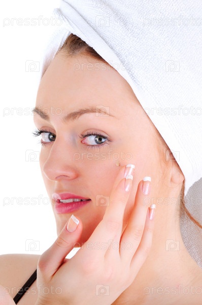 Молодая женщина с белым полотенцем на волосах и отличным маникюром использует крем для лица на белом фоне