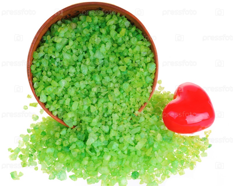 Соль для ароматических ванн и красное сердце на белом фоне
