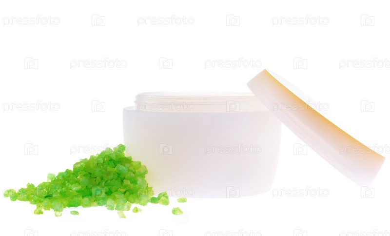 Бежевый контейнер для крема и ароматическая соль, изолированные на белом фоне