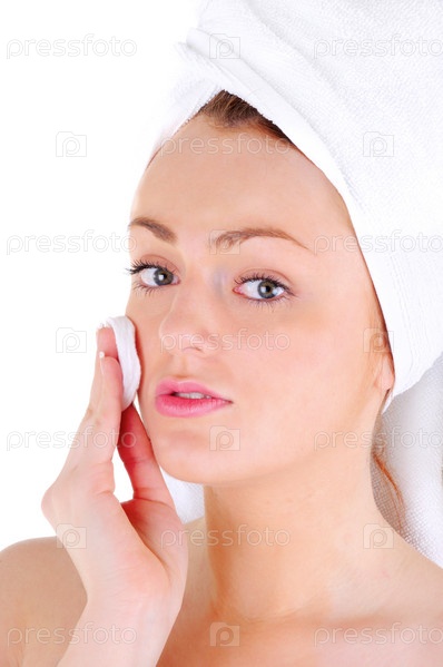 Молодая женщина с белым полотенцем на волосах очищает лицо