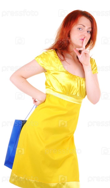 Молодые красивая женщина с синим бумажным пакетом в руках на белом фоне. Фокус на руках женщины