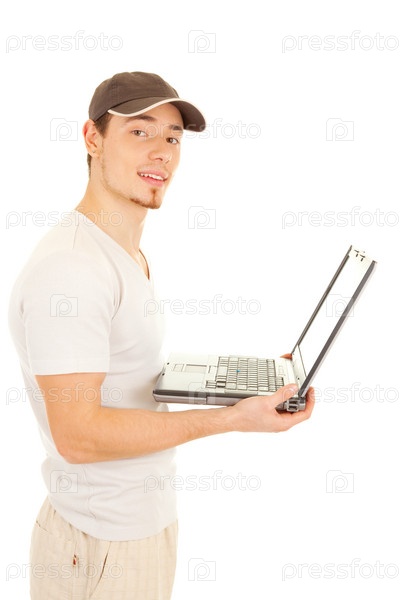Красивый мужчина в повседневной одежде стоит с ноутбуком на белом фоне