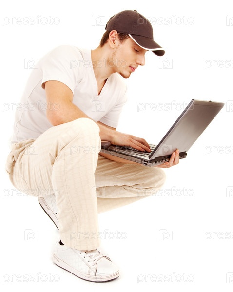 Красивый мужчина в повседневной одежде сидит с ноутбуком на белом фоне