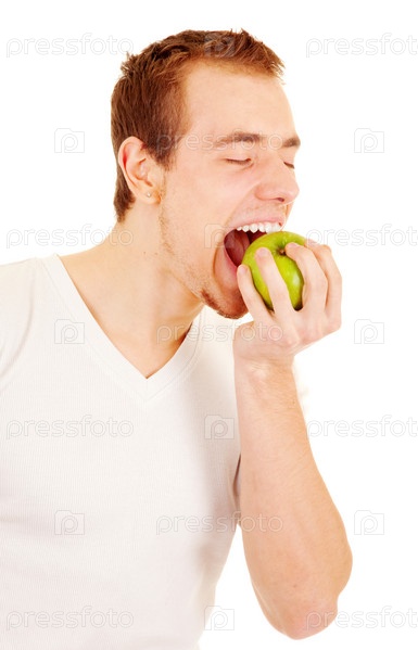 Красивый молодой человек кусает зеленое яблоко в руке на белом фоне