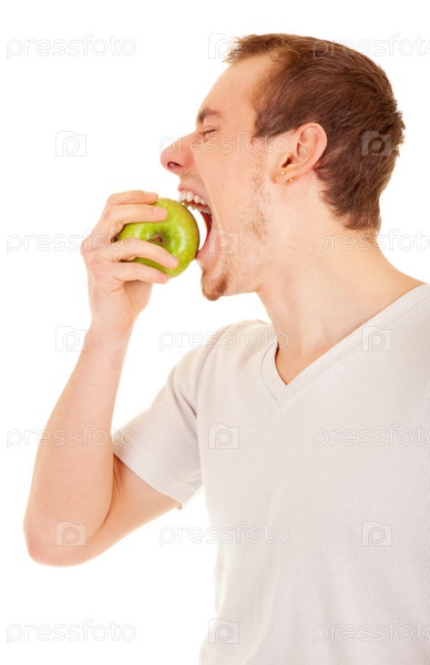 Красивый молодой человек кусает зеленое яблоко в руке на белом фоне