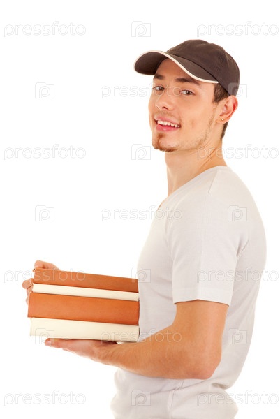 Улыбающийся парень с четырьмя книгами на белом фоне
