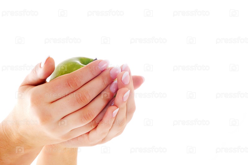 Женские руки с хорошим французским маникюром держат яблоко