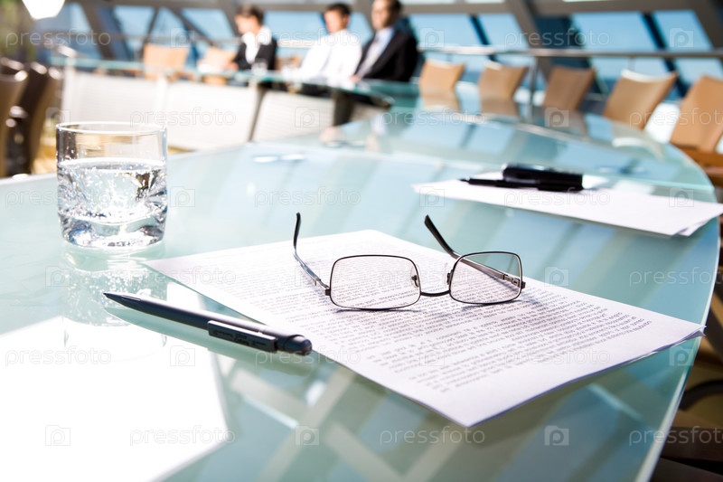 Изображение нескольких объектов, лежащих на столе в конференц-зале