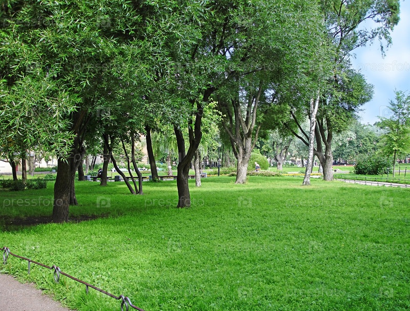 Зеленый парк с деревьями и травой