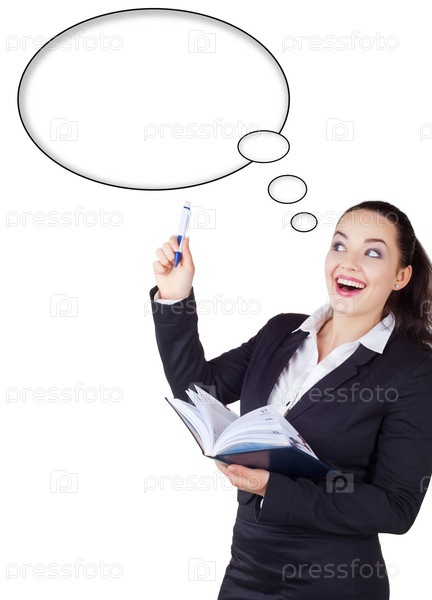 Счастливая деловая женщина с шаблоном для речи в верхней части фотографии, изолированная на белом фоне
