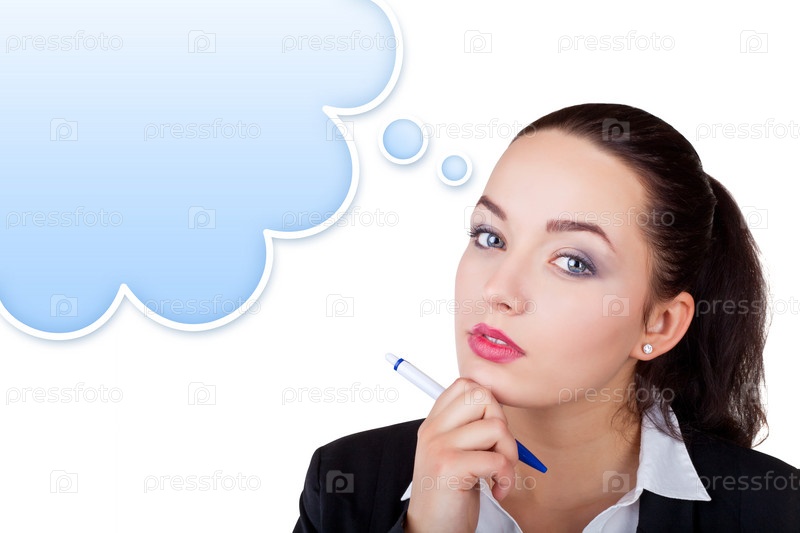 Задумчивая деловая женщина с шаблоном для речи в верхней части фотографии, изолированная на белом фоне