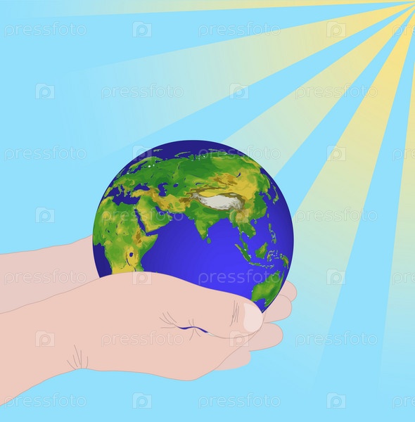 Земля в руках на фоне неба и лучей