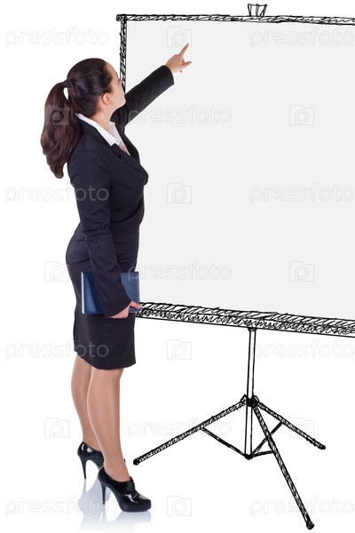 Деловая женщина показывает пальцем на чистую доску для презентаций с местом для текста, изолированная на белом фоне