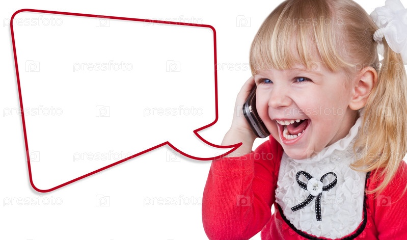 Девочка с телефоном, изолированная на белом фоне с местом для вашего текста в верхней части фотографии