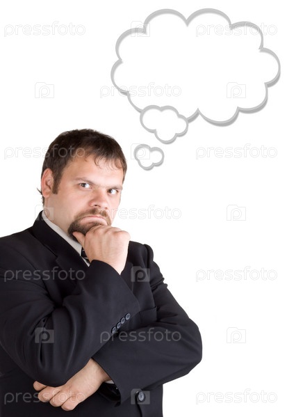 Бизнесмен размышляет, изолированный на белом фоне. Пустое облако для текста в верхней части фотографии