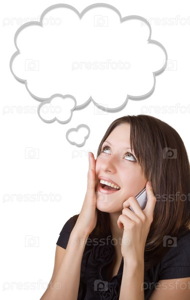 Деловая женщина говорит по мобильному телефону, изолированная на белом фоне. Облако для текста в верхней части фотографии