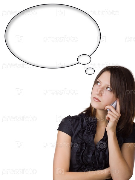 Деловая женщина говорит по мобильному телефону, изолированная на белом фоне. Облако для текста в верхней части фотографии