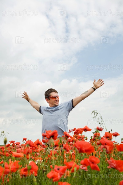 Человек в поле с распростертыми руками