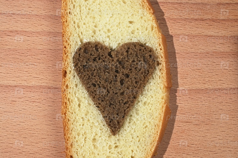 Кусочек белого хлеба с вырезанным сердцем из черного хлеба на разделочной доске