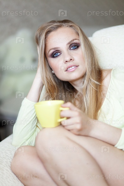 Яркая женщина с чашкой чая сидит на диване