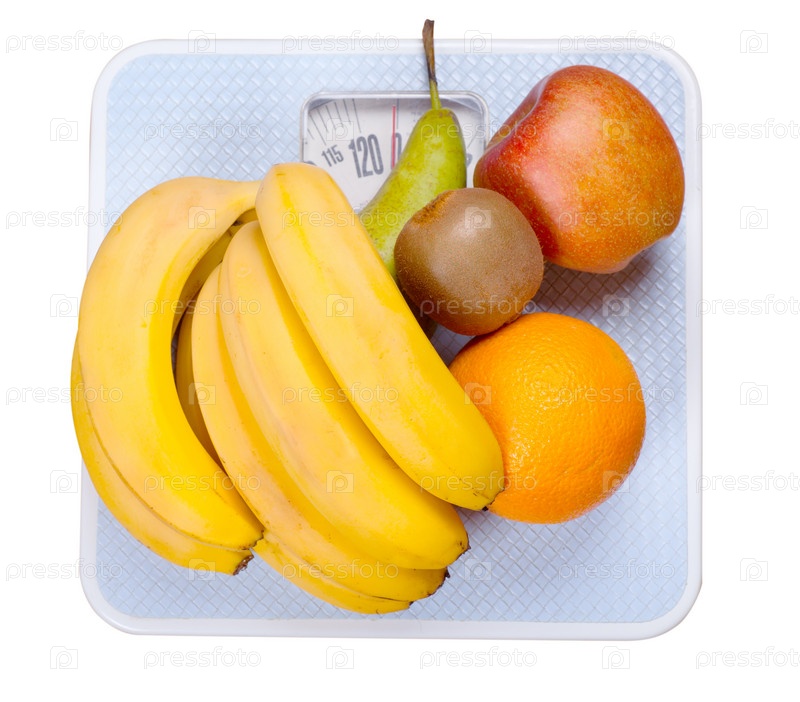 Фрукты на весах, изолированные на белом фоне