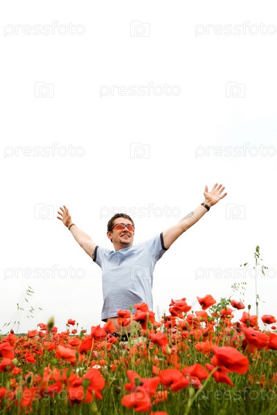Мужчина стоит на маковом поле, раскинув руки