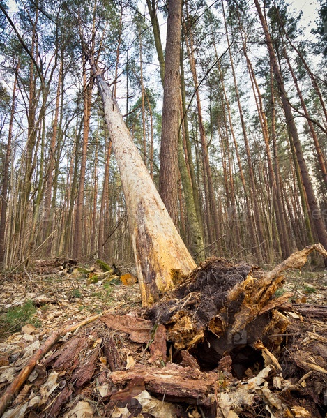 Упавшее дерево с торчащими корнями в густом лесу