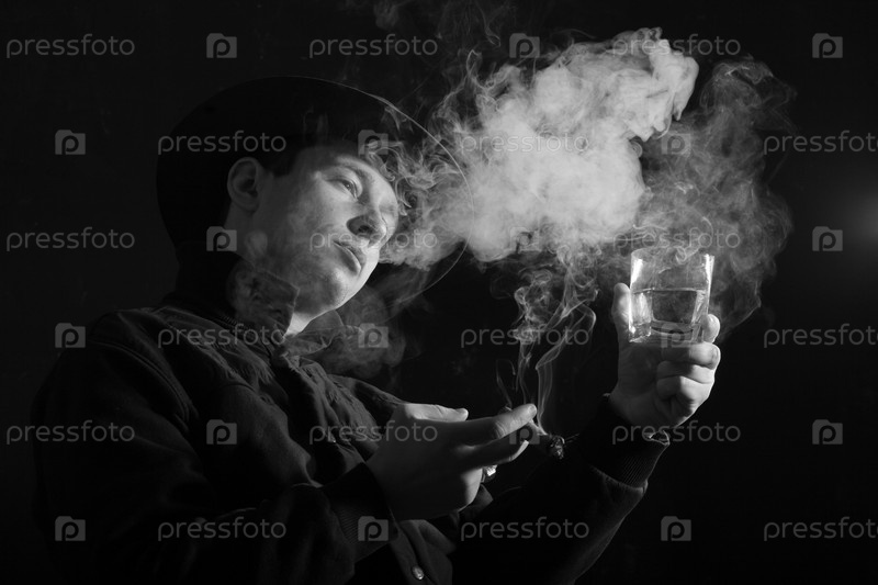 Мужчина в шляпе с бокалом виски в клубах сигарного дыма