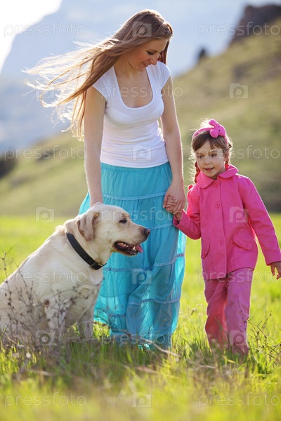 Счастливая семья гуляет с собакой на зеленом поле