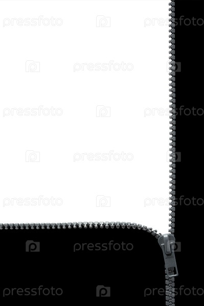 Черно-белый фон с расстегнутой серой пластиковой молнией. Обтравочный контур включен