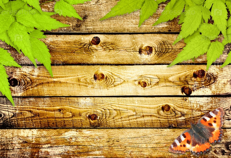 Старые доски, зеленые листья и бабочка