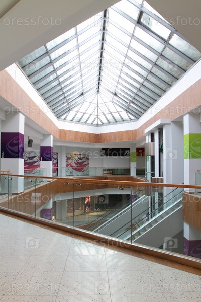 Зал с колоннами и эскалаторами в огромном торговом центре. Вид верхнего этажа со стеклянным потолком