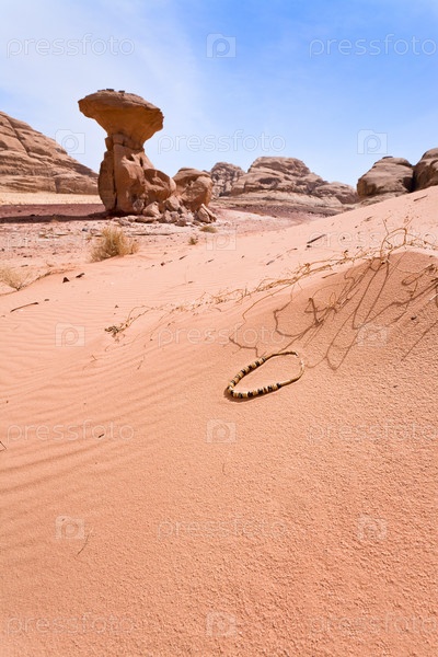 Грибная скала и арабское ожерелье в песчаных дюнах пустыни Вади-Рам, Иордания