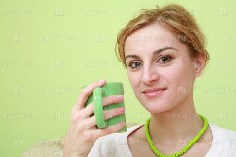 Счастливая женщина с зеленой чашкой