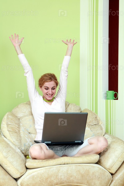 Радостная девушка сидит в кресле перед ноутбуком на фоне зеленой стены