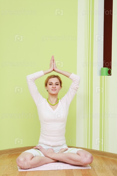 Девушка сидит в позе лотоса на полу и выполняет асану
