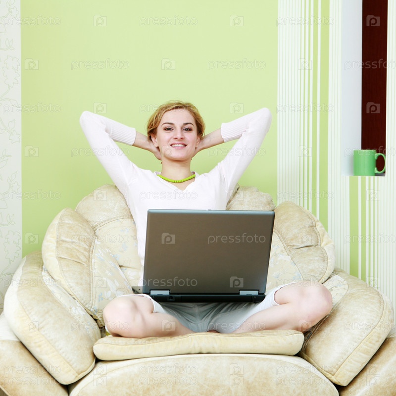 Улыбающаяся девушка сидит в кресле перед ноутбуком на фоне зеленой стены